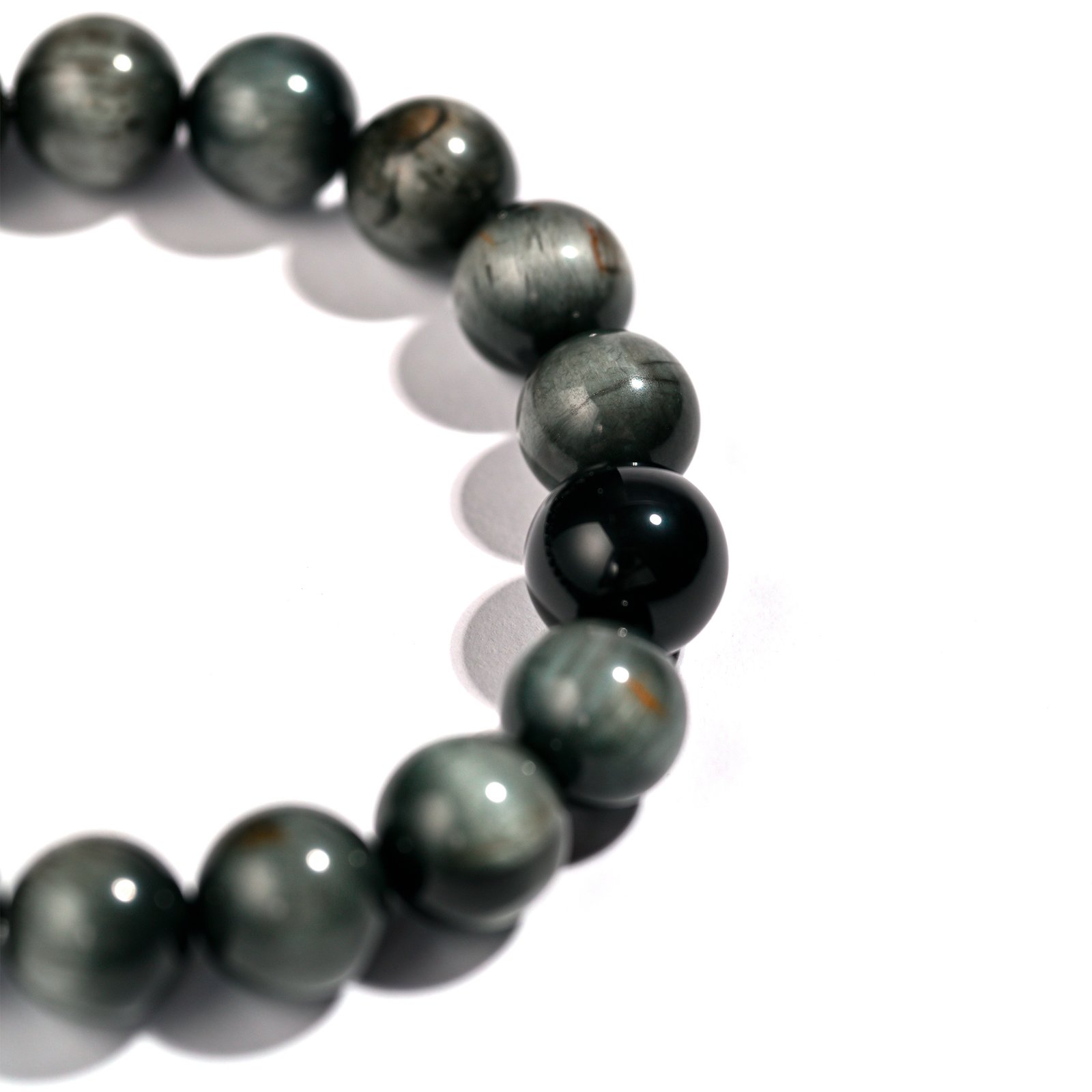 Inspired by the Taoist concept of “When the North Star remains still, all other stars arch it”. The string of hawk-eye stones is like a sky full of stars, forming a powerful force of protection and guidance, helping to see the direction; Just one obsidian, like the Purple Star at the celestial pole, is the sole core and hub. It symbolizes seizing opportunities, holding onto achievements, and maintaining stability and control in the midst of change.